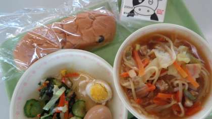 『ぶどうパン ブラックラーメン 煮たまご 海藻サラダ』