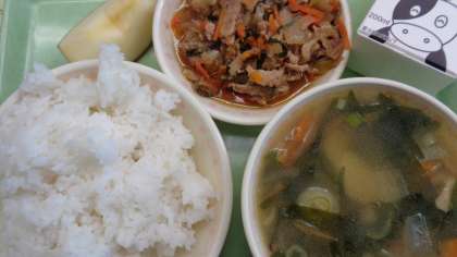 ごはん 韓国風焼き肉 トック入りわかめスープ りんご