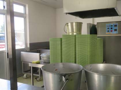 大量の食器、食管、お盆の洗浄、そして給食室の綿密な清掃・洗浄・点検など。