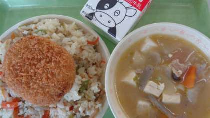 五目ごはん 肉じゃがコロッケ tonton汁