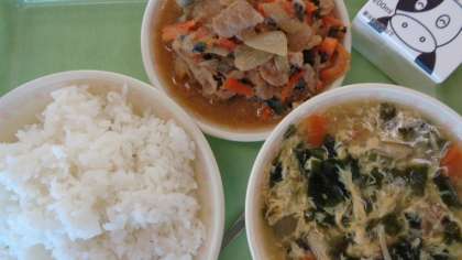 ごはん みそだれ焼き肉 わかめとたまごのスープ