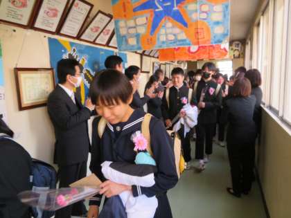 手を振り、写真を撮り、卒業生を見送り、カメラのレンズを見て、