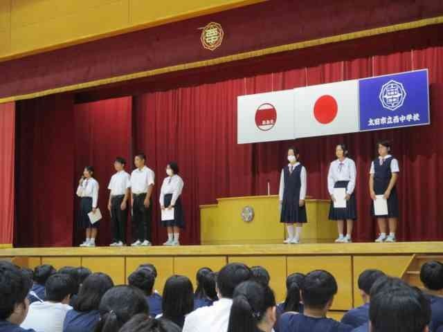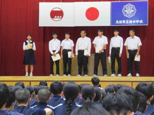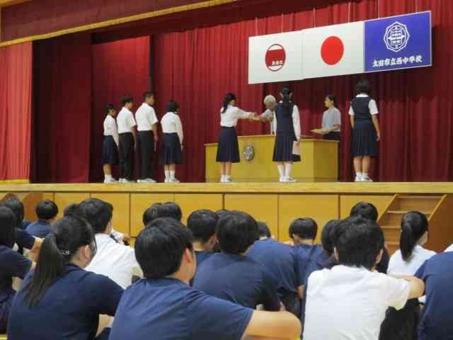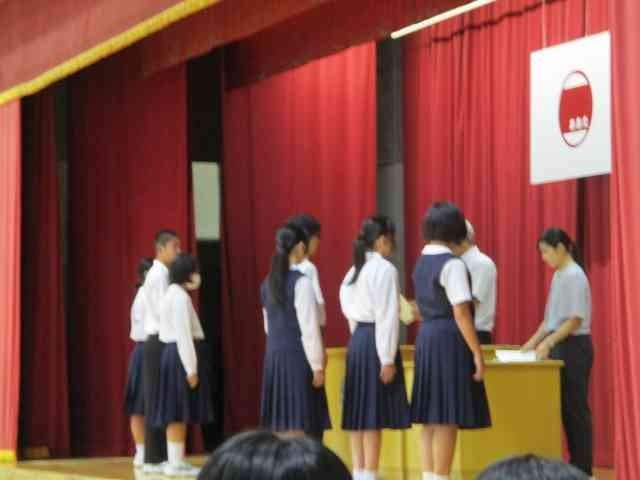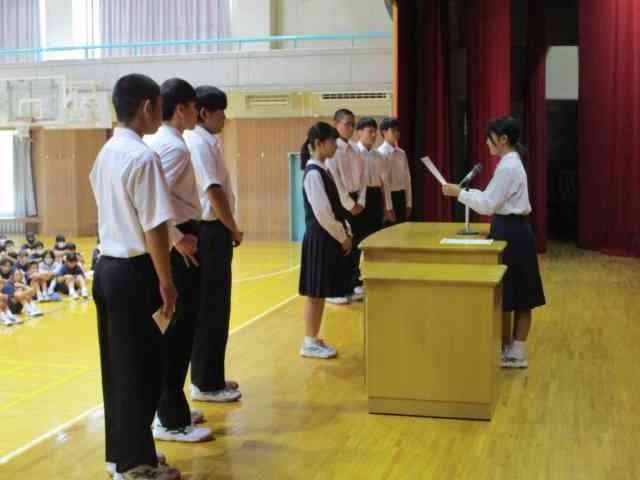 10月8日に、生徒会役員選挙の結果を受けた新本部役員認証式を行いました。自主的な活動により生徒の親睦をはかり、民主的教養を高めるという生徒会の目的を達成すべく新本部役員の方には頑張ってもらいたいと思います。また、新会長から旧本部役員へ感謝状の贈呈も行いました。旧役員のみなさん、1年間ありがとうございました。