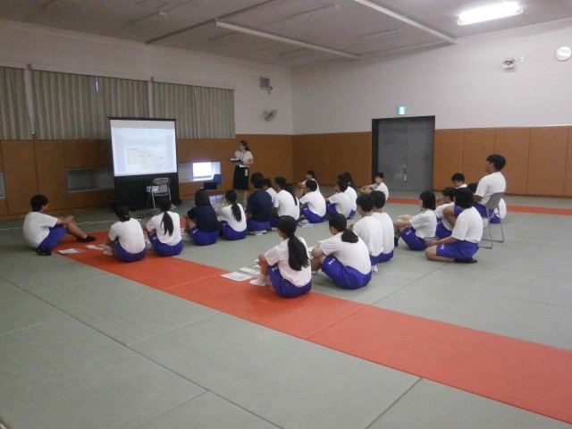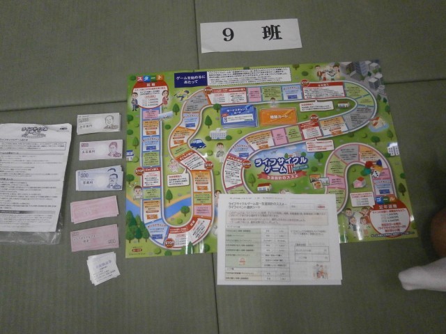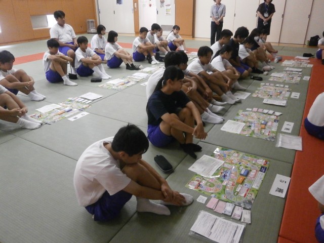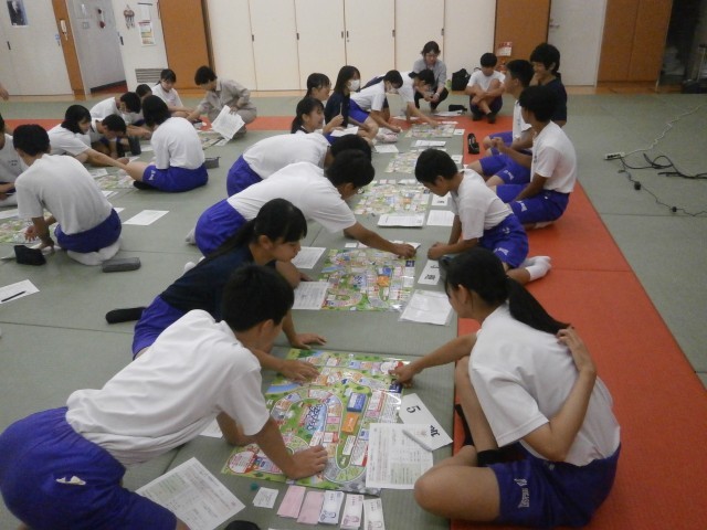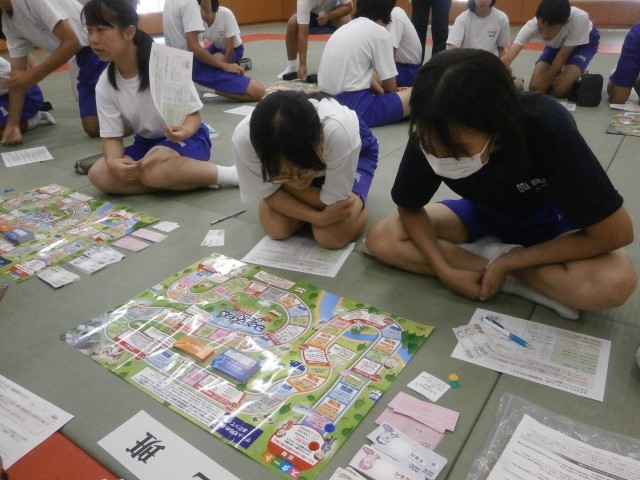 家庭科の授業で民間の保険会社の方を講師にお招きし「消費者教育出張授業」を実施しました。写真は3年3組の授業の様子です。「ライフサイクルゲームⅢで人生を疑似体験!」という双六形式のゲームをとおして、人生のどのタイミングでお金を活用していくかを学びました。