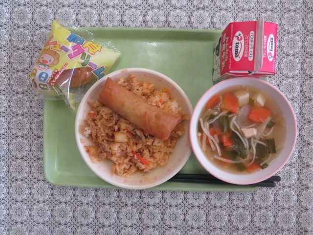 牛乳 ごはん 豚キムチご飯の具 春巻き 酸辣湯(サンラータン) シューアイス