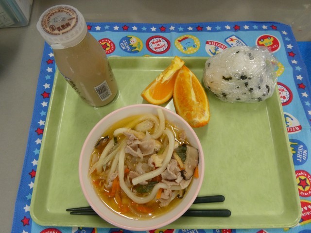 本日の献立は、「わかめご飯の手作りおにぎり、コーヒー牛乳、肉うどん、オレンジ」 まず、おにぎりをひと口。手作りしてくださった調理員さんの愛情が伝わってきます。とても、おいしいです。うどんは肉がたくさん入っていて、おにぎりとよく合うおいしさです。オレンジは、口いっぱいに甘さが広がるおいしさです。コーヒー牛乳は、高級感あふれる贅沢な味です。明日の体育祭、頑張るぞ!と元気が出てきました。