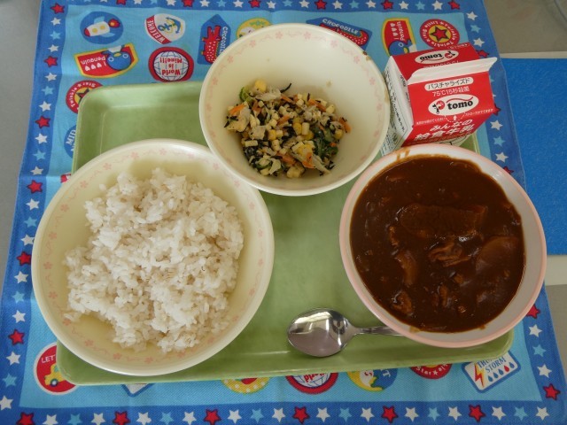 本日の献立は、「麦ご飯、牛乳、ハヤシライス、ひじきサラダ」 ハヤシライスは、大きなじゃがいもとたまねぎ、豚肉などが口の中でとろけて、麦ご飯とよく合うおいしさです。ひじきサラダは、マヨネーズやチーズ、ごまの風味が特徴的でとてもおいしいです。