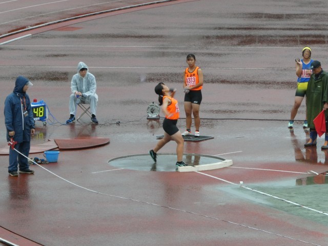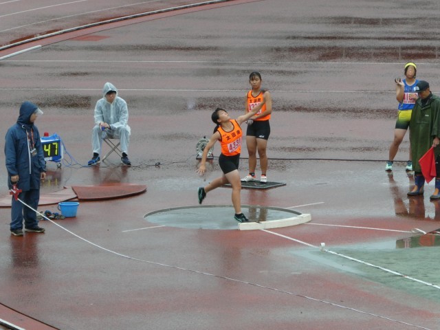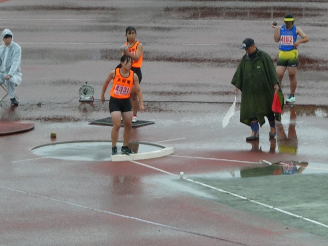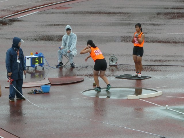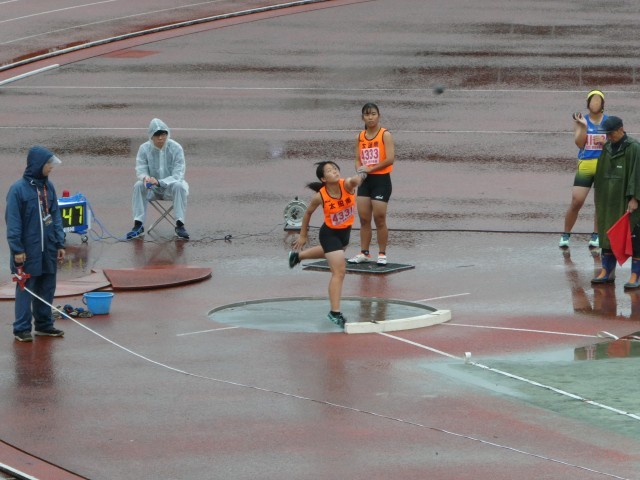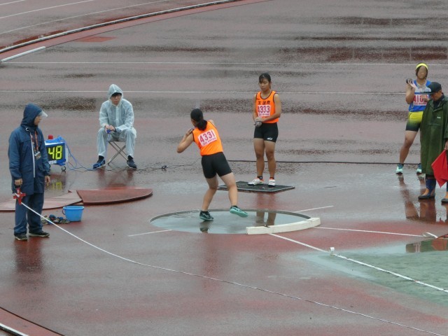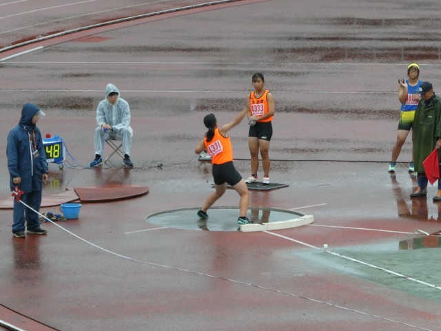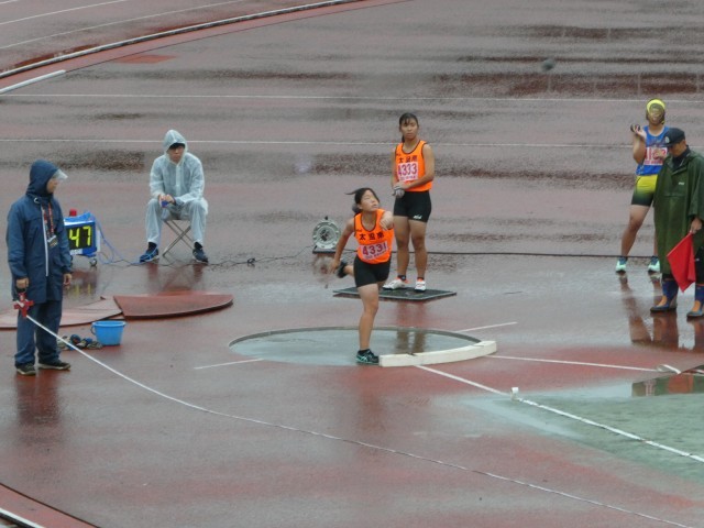 写真は、共通女子砲丸投の様子です。体全体を使って、力強く投げる姿が素晴らしいです。結果は、第3位と第4位に入賞となりました。女子共通4×100mリレーで第2位、女子共通走幅跳で第7位に入賞しました。おめでとうございます。