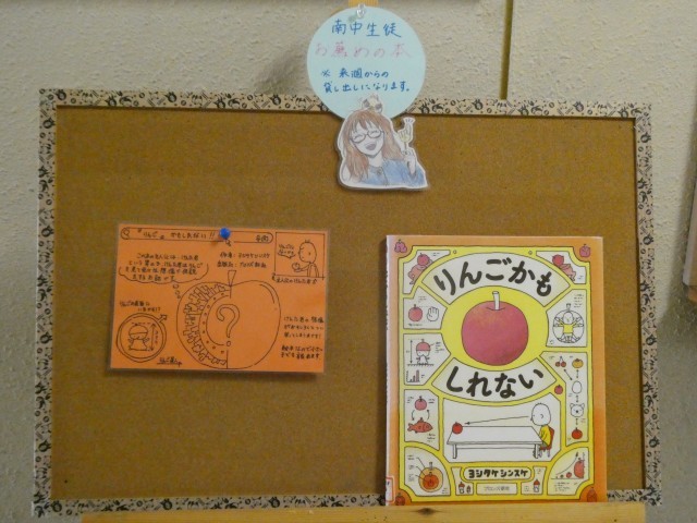 10月15日 そうだ、図書室へ行こう 公開日 2025/10/15 更新日 2025/10/15 学校のようす 今週の南中生徒 お薦めの本は、『りんごかもしれない』です。ぜひ、手に取って、読んでみてください。