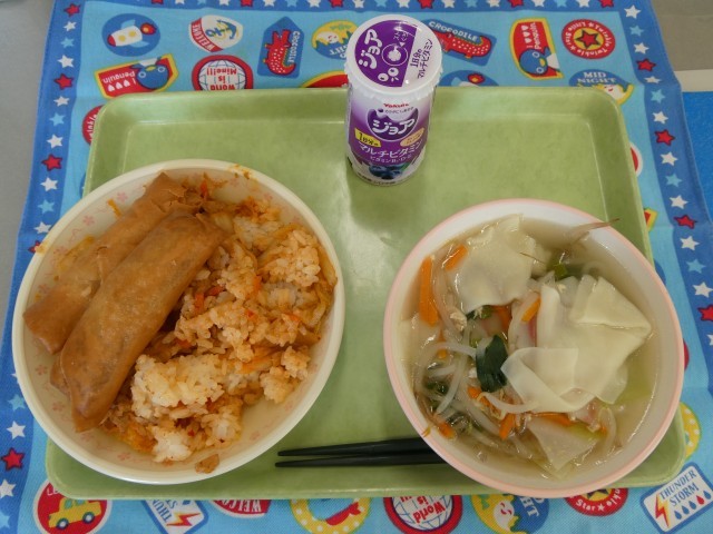 本日のリクエスト献立は、「ご飯、ジョアブルーベリー、豚キムチご飯の具、春巻き、ワンタンスープ」 外はサクサク、中はジューシーの春巻きは、豚キムチご飯とよく合い、とてもおいしいです。スープは、ワンタン、もやし、鶏肉、なるとなど、たくさんの具が入っていて、とてもおいしいです。ジョアはブルーベリー味が口の中いっぱいに広がるおいしさです。