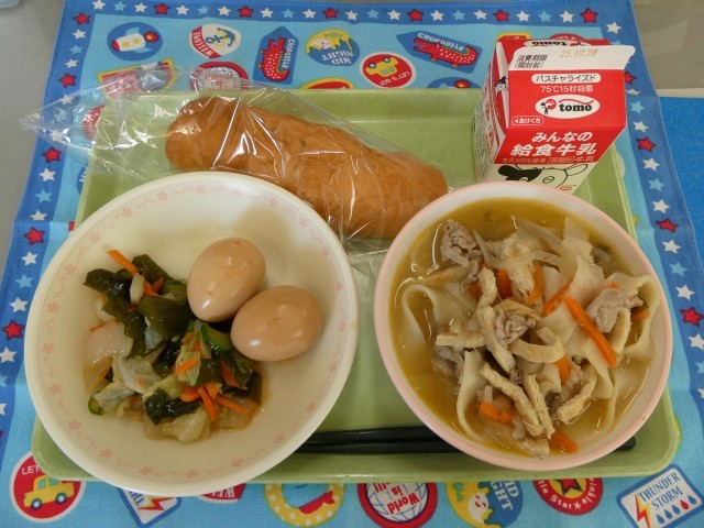 本日の献立は、「ゆめロールパン、牛乳、おっきりこみ、煮玉子、こんにゃくサラダ」 平べったい形の特徴的な麺、豚肉、油揚げ、ねぎ、大根、ごぼう、しいたけなどが入ったおっきりこみ。とにかく、おいしいです。サラダは、しっかりとしたガーリック味で香りもよく、とてもおいしいです。さらに、煮玉子とゆめロールパンも食べられて、心も体も満腹です。