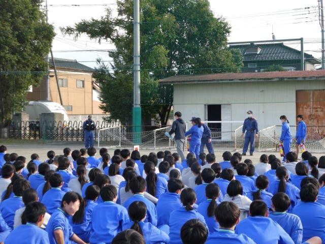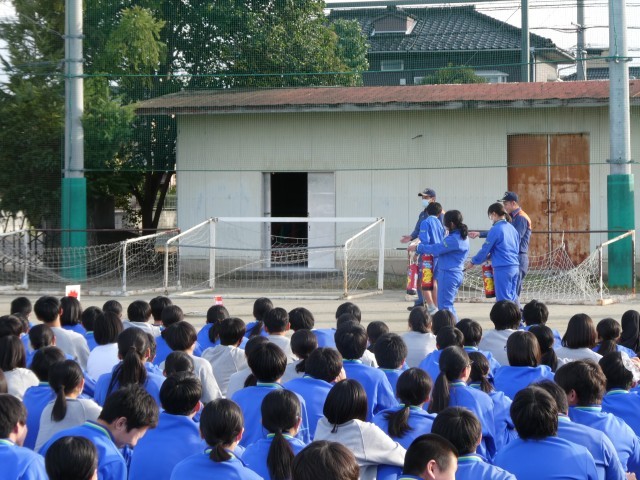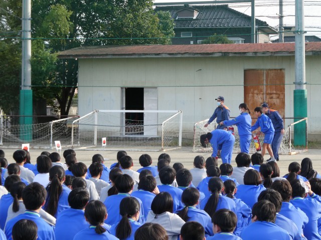 「火事だ!火事だ!」 太田市消防本部職員の模範訓練を見た後、各学年の安全委員代表生徒が水消火器を使った消火訓練を行いました。大きな声を出しながら、立派な態度で消火訓練を行うことができました。