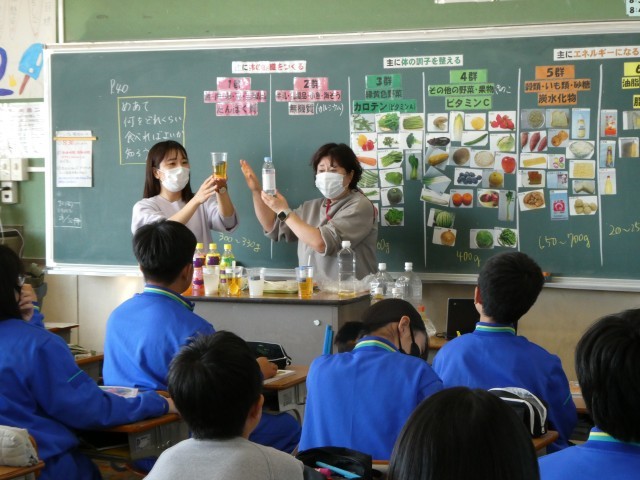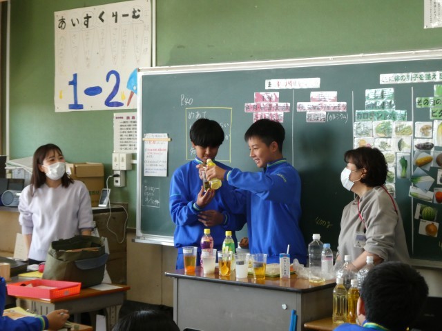 11月4日 1年2組 家庭科 ビタミン実験 公開日 2025/11/04 更新日 2025/11/04 学校のようす 先週から引き続き、1年2組でもビタミン実験が行われました。色の変化を見て、「おお、すごい!」という歓声が湧き上がりました。