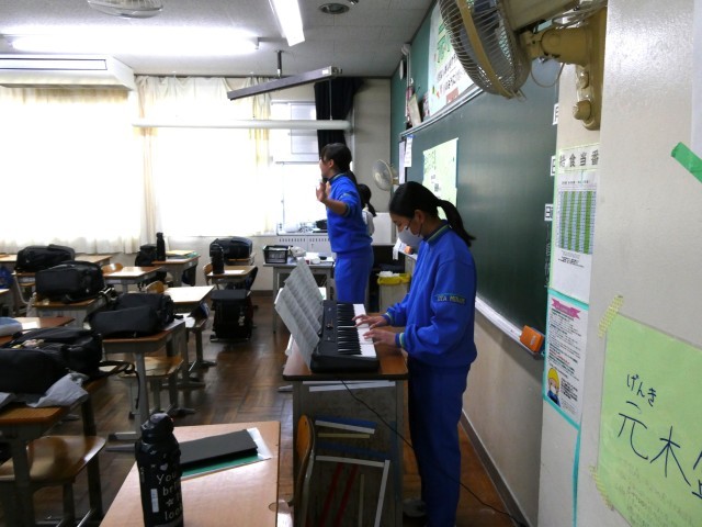 手をつなぎ、体を左右に動かしながら、練習に励んでいます。