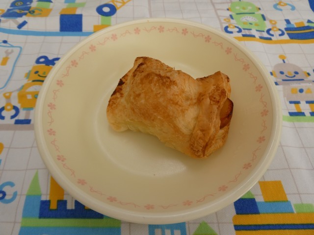 本日の献立は、「ご飯、牛乳、さばの塩こうじ焼き、しらたきのごま和え、わかめと豆腐のみそ汁、手作りアップルーンパイ(2ー2、2-3)」 塩こうじ味の肉厚なさばは、ご飯がよく進むおいしさです。ごま和えは、しらたきの食感が特徴的で、さばとよく合うおいしさです。わかめ、豆腐、ねぎ、油揚げが入ったみそ汁もジューシーなアップルーンパイもとてもおいしいです。