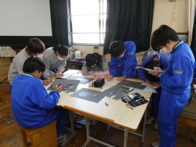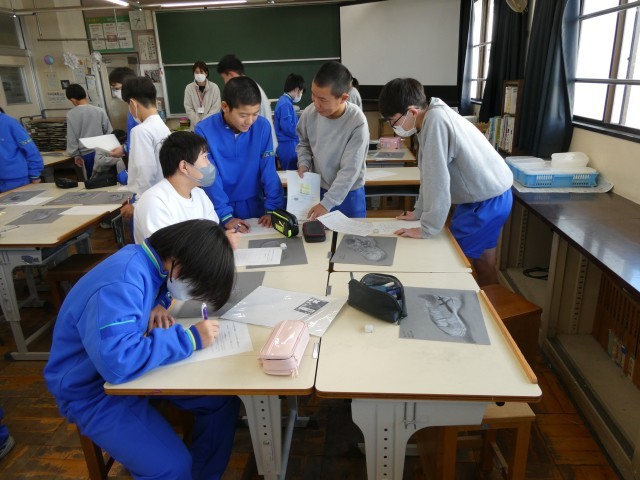 11月21日 1年5組 美術 「鑑賞」① 公開日 2025/11/21 更新日 2025/11/21 学校のようす 自分の作品について説明したあと、お互いの作品を鑑賞し合って、良いと感じたことをふせんに書いて貼り付けたり、ワークシートに書いたりして、学び合っています。