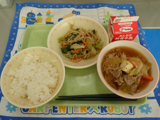 本日の献立は、「ご飯、牛乳、すき焼き風煮、ごまみそ和え」 肉と野菜がたっぷり入っていて、ほんのり甘い絶妙な味付けのすき焼き風煮。とてもおいしく、ご飯も進みます。和え物は、キャベツ、もやし、ほうれん草などの食感がよく、さっぱりとしたごまみそ味でとてもおいしいです。