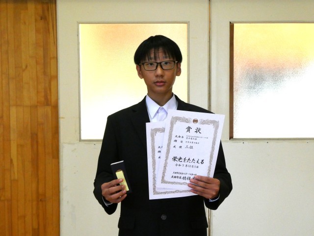 太田市民総合スポーツ大会 空手道部 個人 表彰⑤ 公開日 2025/11/28 更新日 2025/11/28 学校のようす 2025年太田市民総合スポーツ大会 空手道大会 中学生男子形 敢闘賞 中学生男子組手 3位