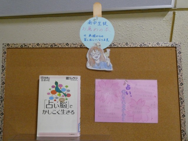 12月1日 そうだ、図書室へ行こう 公開日 2025/12/01 更新日 2025/12/01 学校のようす 今週の南中生徒 お薦めの本は、 「占い脳」でかしこく生きる です。運に対しての良い考え方が書かれており、ネガティブからポジティブになれるかも。ぜひ、手に取って読んでみてください。