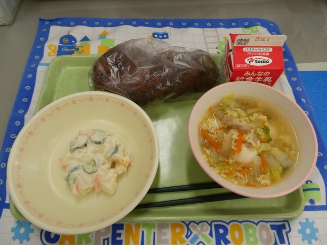 本日のリクエスト献立は、「ココア揚げパン、牛乳、ポテトサラダ、ABCスープ」 食欲をそそる甘い香りの揚げパン。ココアと砂糖の味がたまらなくおいしいです。サラダは、濃厚なポテトの味がとてもおいしいです。スープは、マカロニ、ベーコン、キャベツ、うずら卵など、具だくさんで、おいしさが口の中いっぱいに広がります。