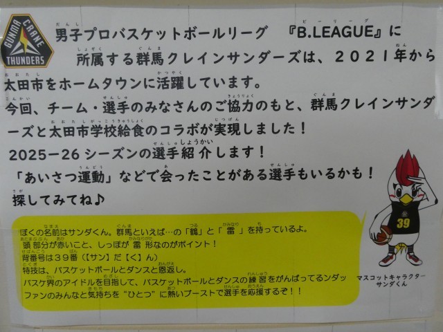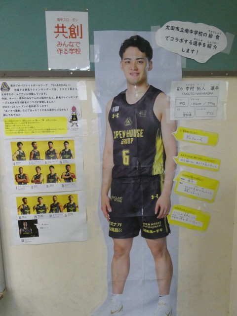 群馬クレインサンダーズの熱烈なファンのひとりである先生と一緒に写真を撮ってみました。生徒玄関で皆さんもぜひ、背比べしてみてください。