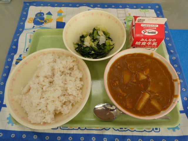 12月5日 チキンカレー 公開日 2025/12/05 更新日 2025/12/05 学校のようす 本日の献立は、「麦ご飯、牛乳、チキンカレー、小松菜サラダ」 少し辛口で濃厚なチキンカレー。特に鶏肉とじゃがいもの食感がよく、元気が出るおいしさです。サラダは、小松菜、キャベツ、ツナがやさしいレモン味で包まれ、とてもおいしいです。