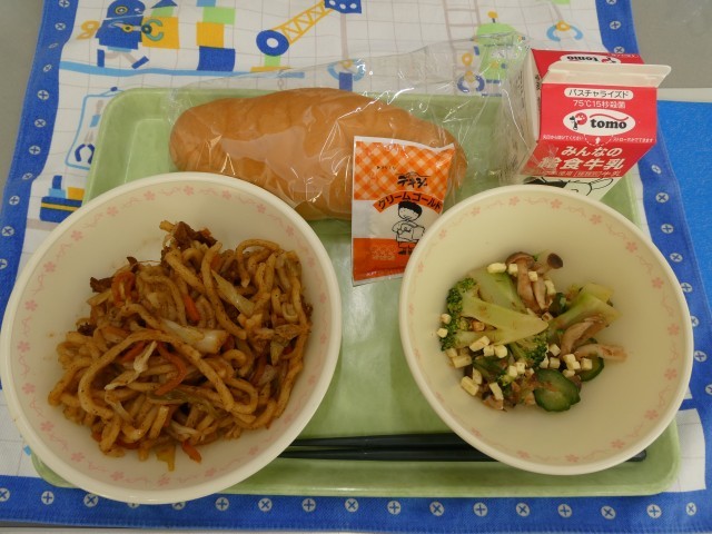 本日の献立は、「小コッペパン、シュガークリーム、牛乳、ソースもまるごと太田焼きそば、ブロッコリーのおかかチーズ和え」 特徴的なソース味の太田焼きそば。何度食べてもおいしです。和え物は、チーズ、ブロッコリー、しめじ、きゅうり、かつお節が調和していて、味わい深いです。シュガークリーム入りのコッペパンもおいしいです。
