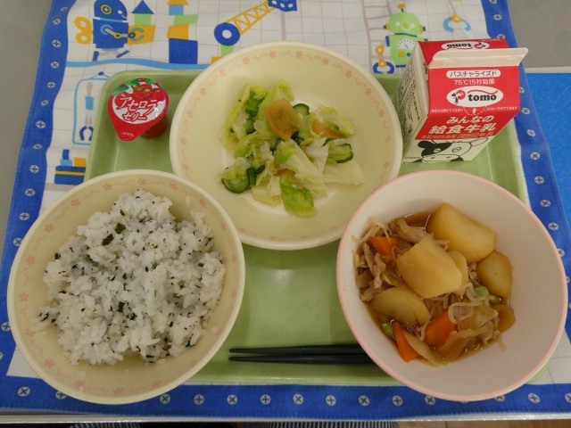 本日の献立は、「わかめご飯、牛乳、肉じゃが、つぼ漬け和え、ミニアセロラゼリー」 じゃがいも、豚肉、たまねぎなどがじっくり煮込まれた肉じゃがは、わかめご飯とよく合うおいしさで、心も体も温まります。和え物は、たくあん、キャベツ、きゅうりなどの食感が良く、さっぱりとしたおいしさです。ゼリーも食べられて幸せです。
