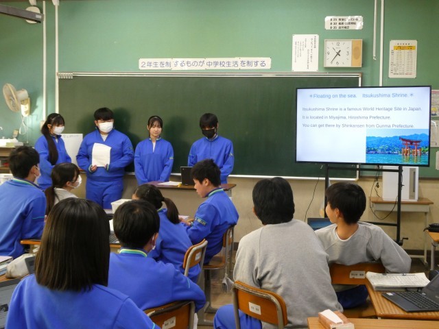 12月12日 2年7組 英語 国内の好きな場所を紹介② 公開日 2025/12/12 更新日 2025/12/12 学校のようす 英文と写真をスライドにまとめ、視覚的にも分かりやすくなるよう、工夫をしています。