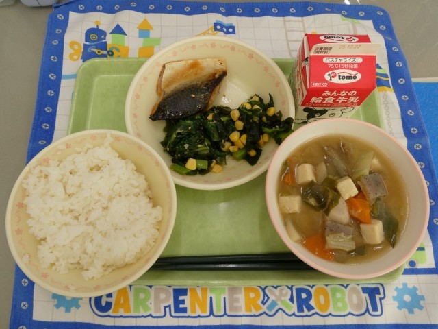 本日の献立は、「ご飯、牛乳、さばの西京焼き、太田青菜の山吹和え、太田野菜のみそけんちん汁、手作りアップルーンパイ(3-2,3-3)」 肉厚のさば。小松菜やかき菜が入った和え物。ご飯がよく進むおいしさです。けんちん汁は、大根、ねぎ、白菜など、野菜たっぷりでみそ味が抜群においしいです。手作りパイは、ジューシーで今日もおいしいです。