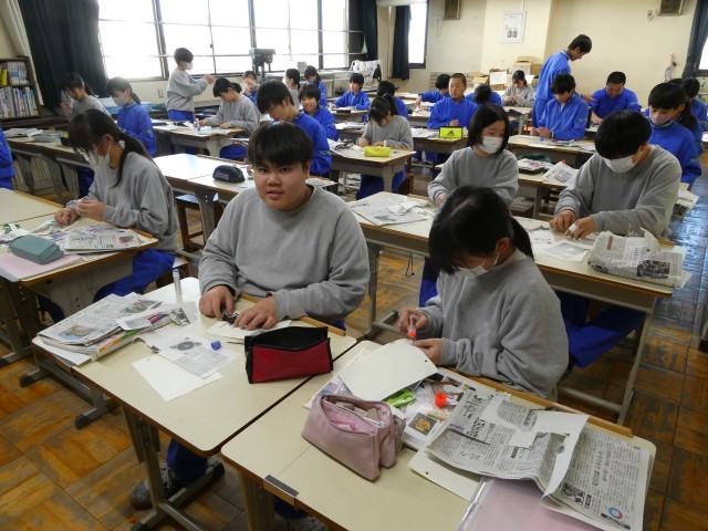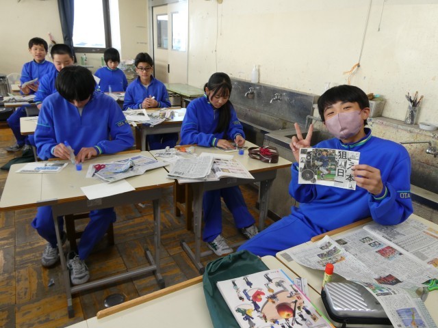 新聞紙を使って、好きな写真や画像を構成して貼るコラージュの体験学習しています。みんな笑顔で楽しそうです。