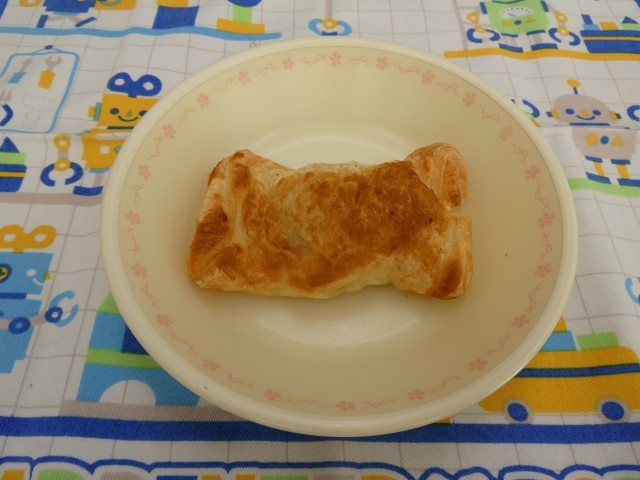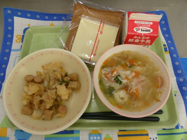 本日の献立は、「黒食パン、牛乳、スライスチーズ、ジャーマンポテト、ワンタンスープ、手作りアップルーンパイ(3-4,3-5)」 ほくほくのじゃがいも、ウィンナーがたっぷり入ったジャーマンポテト。チーズをはさんだパンにもよく合うおいしさです。スープは、とろっとした食感のワンタンがたまらなくおいしいです。手作りパイも最高においしいです。
