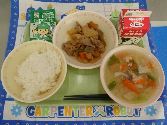 本日の献立は、「ご飯、ふりかけ、牛乳、大根と豚肉の煮物、鶏肉ときのこのジンジャースープ」 大根、豚肉、さつま揚げなど、いろいろな具材が調和していて、味わい深い煮物。ふりかけご飯がよく進むおいしさです。スープは、しょうがの程良い風味が鶏肉やきのこなどを包み込んでいて、おいしいです。心も体もあたたまります。