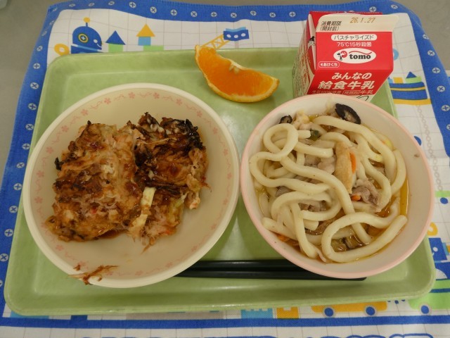 本日の献立は、「手作りお好み焼き、牛乳、肉うどん、オレンジ」 肉厚のおさかなソーセージ、キャベツ、さくらえびなど、何種類もの具がソースとマヨネーズで包まれたお好み焼き。ボリュームたっぷりでおいしいです。うどんは、豚肉、油揚げ、しいたけなど、具だくさんで抜群においしいです。最後にオレンジも食べられてうれしいです。