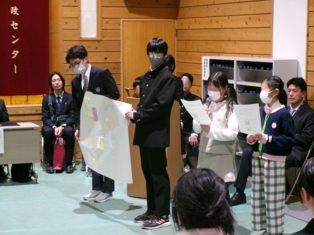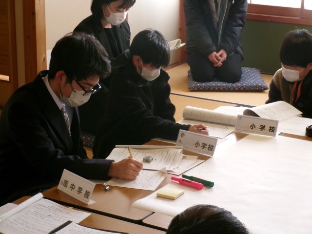 小・中・義務教育学校の児童生徒代表が宝泉行政センターに集まり、いじめ防止に関する各校の取り組みやいじめをなくすためにできることについて、班に分かれて活発に話し合い、最後に全体でその結果を発表しました。南中学校からは、生徒会長が参加しました。今後の南中いじめ防止活動につなげていきます。