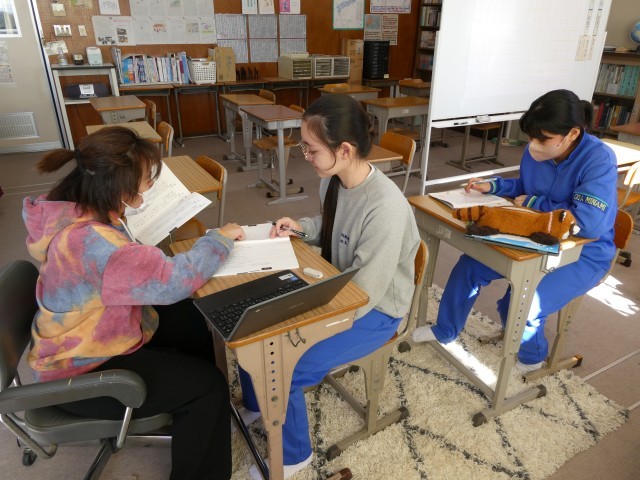 高校進学にむけて、3年生が先生に質問をしながら、国語や面接の仕方について、主体的に学習しています。