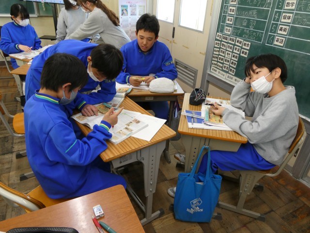 次にクラス全体を①農作物 ②交通 ③職業 の3グループに分けて、他の班で同じ内容を調べた人と線を引いた重要語句(キーワード)について、確認し合っています。