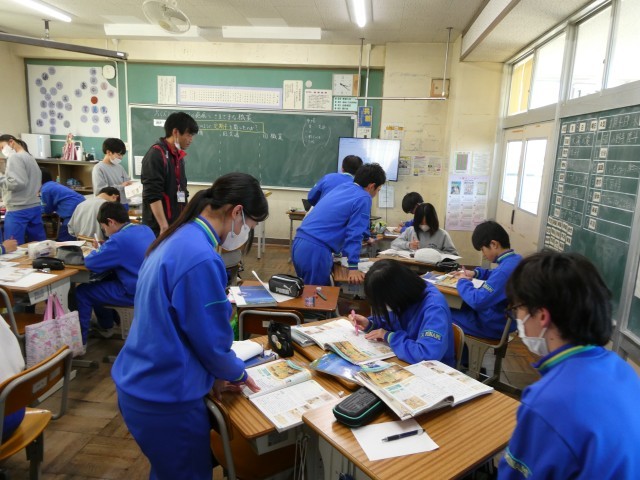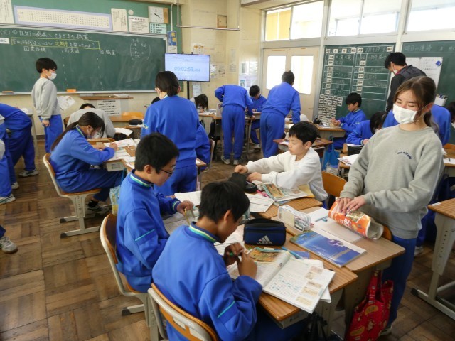 最後に自分の班で、①農作物 ②交通 ③職業 それぞれについての重要語句(キーワード)と、なぜ、その言葉が重要なのか、班の仲間に起立しながら、説明しています。