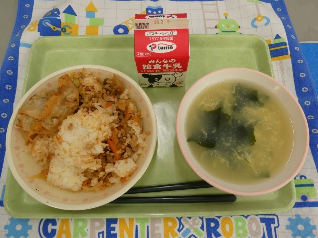 本日の献立は、「ご飯、牛乳、中華風混ぜご飯の具、いそぎょうさ、かきたまわかめスープ」 こりこりっとしたザーサイの独特な食感がたまらなくおいしい混ぜご飯。かりっとした、ぎょうざともよく合います。スープは、わかめ、かきたま、豆腐などが口の中でとろけて、おいしいです。