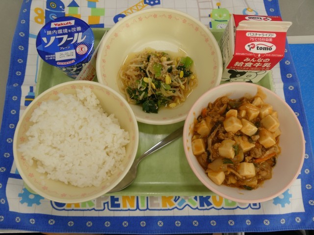 2月6日 麻婆豆腐 公開日 2026/02/06 更新日 2026/02/06 学校のようす 本日の献立は、「ご飯、牛乳、麻婆豆腐、大豆もやしのナムル、ヨーグルト」 豚ひき肉、豆腐、しいたけなどの食感がよくて、とてもおいしい麻婆豆腐。ごま風味の大豆もやし、小松菜などが味わい深いナムル。どちらもご飯によく合います。最後にすっきり味のヨーグルトを食べられて、幸せです。