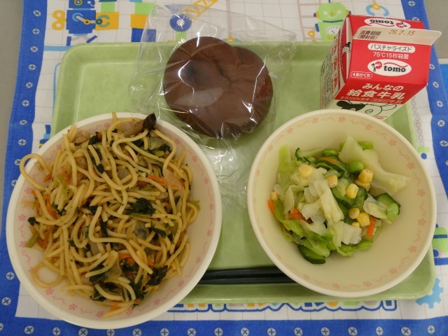 本日の献立は、「ココアパン、牛乳、かき菜とベーコンのスパゲティ、枝豆サラダ」 かき菜とベーコンが調和し、細麺で口あたりのよい、おいしいスパゲティ。主人公の枝豆をキャベツ、きゅうり、コーンなどが味を引き立てている、さっぱりとしたサラダ。ココアの風味が口いっぱいに広がるパン。お腹いっぱい食べられて今日も幸せです。