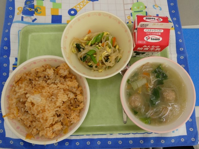 本日の献立は、「ご飯、牛乳、ビビンバ(肉そぼろ)、ビビンバ(ナムル)、春雨スープ」 肉そぼろ、白菜などの食感がよく、ほんのり辛口なビビンバ。ナムルは、さっぱりとした韓国ドレッシングとシャキシャキとした、だいずもやしが特においしいです。スープは、とろっとした春雨、ボリュームのあるミートボールが味わい深いです。