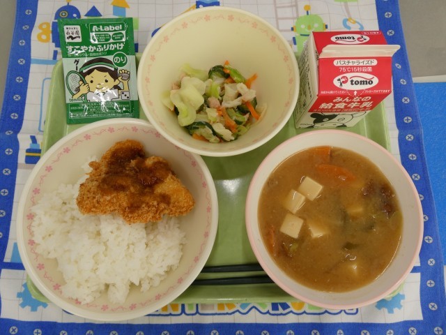 本日の献立は、「ご飯、ふりかけ、牛乳、手作りチキンカツ(1年・職員)、ハムカツ(2年)、ツナサラダ、なめこのみそ汁」 外はサクサク、中は肉厚でボリュームたっぷりの手作りチキンカツ。外はカリッと、中は濃厚な味がするハムカツ。ふりかけご飯がよく進みます。ツナ、きゃべつ、きゅうりなどが入ったさっぱり味のサラダ。とろっとした食感がたまらなくおいしい、なめこのみそ汁。お腹いっぱいで今日も幸せです。