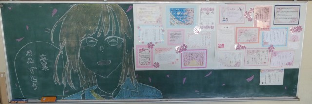 3月12日 祝電とともに 公開日 2026/03/12 更新日 2026/03/12 学校のようす 祝電とともに、生徒会本部役員の生徒が描いた作品が掲示されています。3年生の皆さん、卒業おめでとうございます。