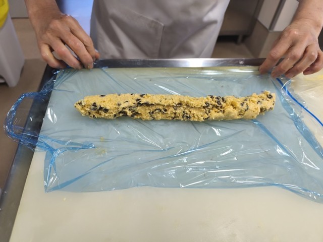 2 クッキー生地をラップで包み形を整え輪切りにします