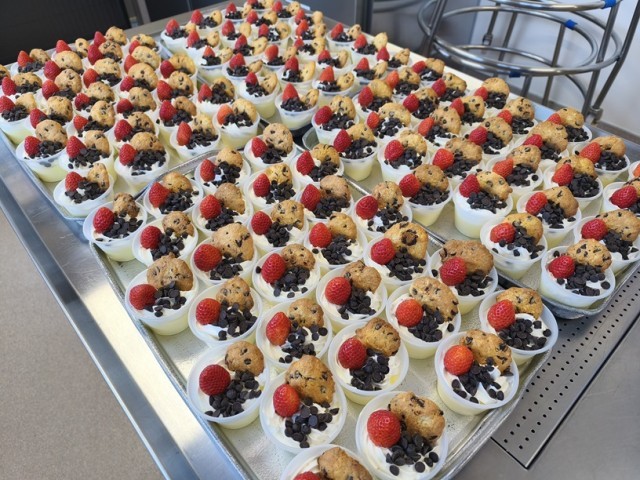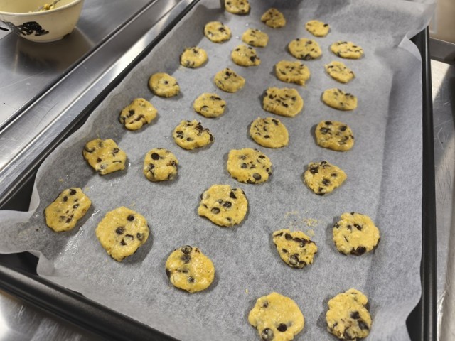 これだけでも十分に美味しいですが、単なるデザートではなく、給食としての栄養価価値を見いだすために、おからを加えたクッキーも作り、プリンに飾りました。