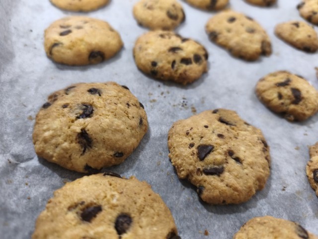 4 焼き上がりです。黒い粒はチョコチップ   白い粒がおからです