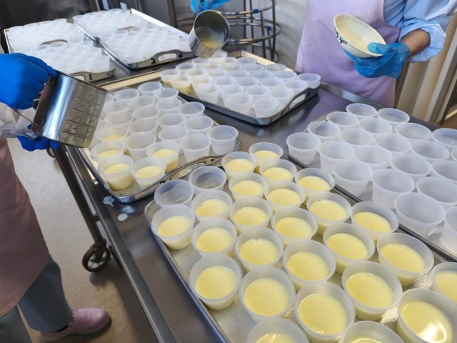 5 プリン液を300個の容器に注いでいきます