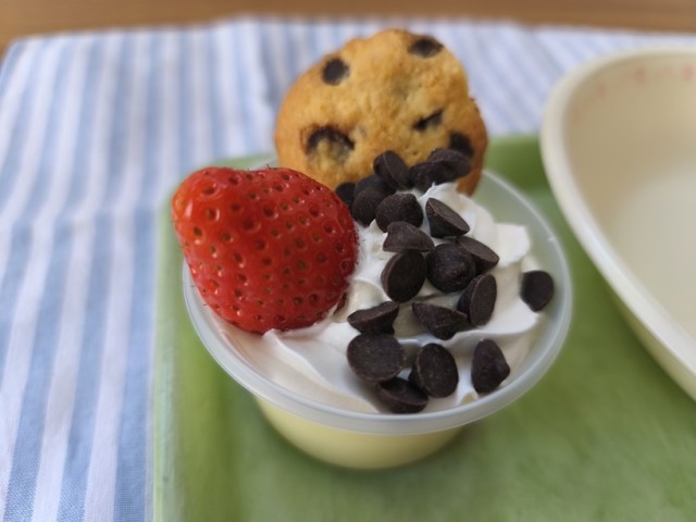プリン液を冷やし固め、ホイップクリーム、いちご、チョコチップをトッピングとして飾ります。