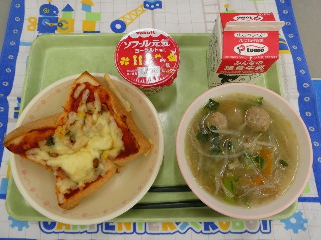 3月19日 手作りピザトースト 公開日 2026/03/19 更新日 2026/03/19 学校のようす 本日の献立は、「手作りピザトースト、牛乳、春雨スープ、ヨーグルト」 厚切りのパンにとろ~りしたピザがのったボリュームたっぷりのトースト。食感のよい鶏肉団子、春雨、もやし、チンゲン菜など具だくさんのスープ。すっきり味のヨーグルト。おいしさ満点で今日も幸せです。